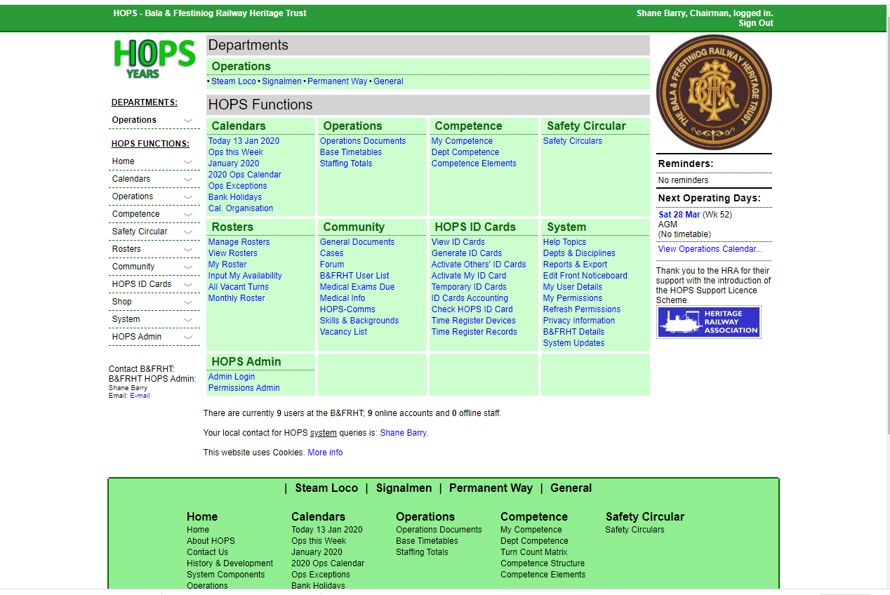 Welcome to the administration panel for the Bala & Ffestiniog Railway Heritage Trust. This panel is designed to provide quick links to the various administration groups and pages used by the Trust to carry out its works. Any issues please contact the Chairman.